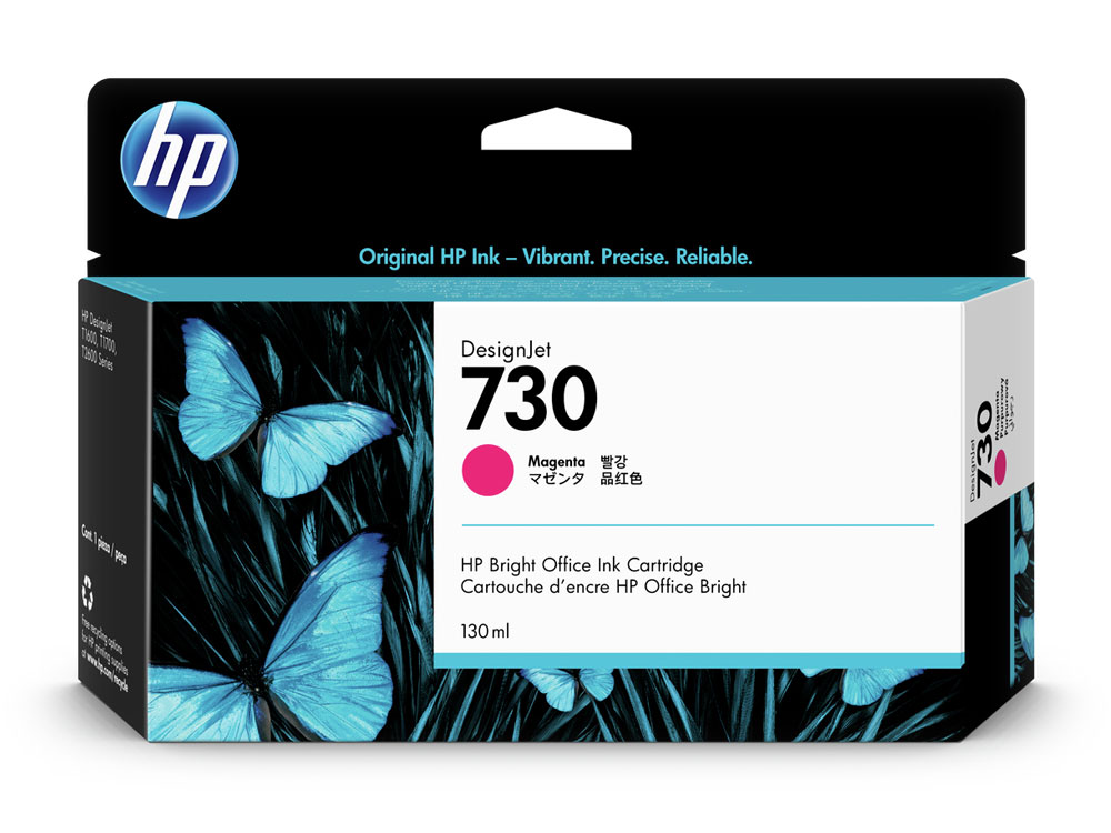 HP 730 DesignJet Tinte wurde zusammen mit Ihrem HP Designjet Drucker als optimiertes Drucksystem konzipiert. Original HP Tinten reduzieren Ausfallzeiten und steigern die Produktivität. Dank gestochen scharfer, schnell trocknender, wischfester Ausdrucke können Druckjobs schneller abgewickelt werden.